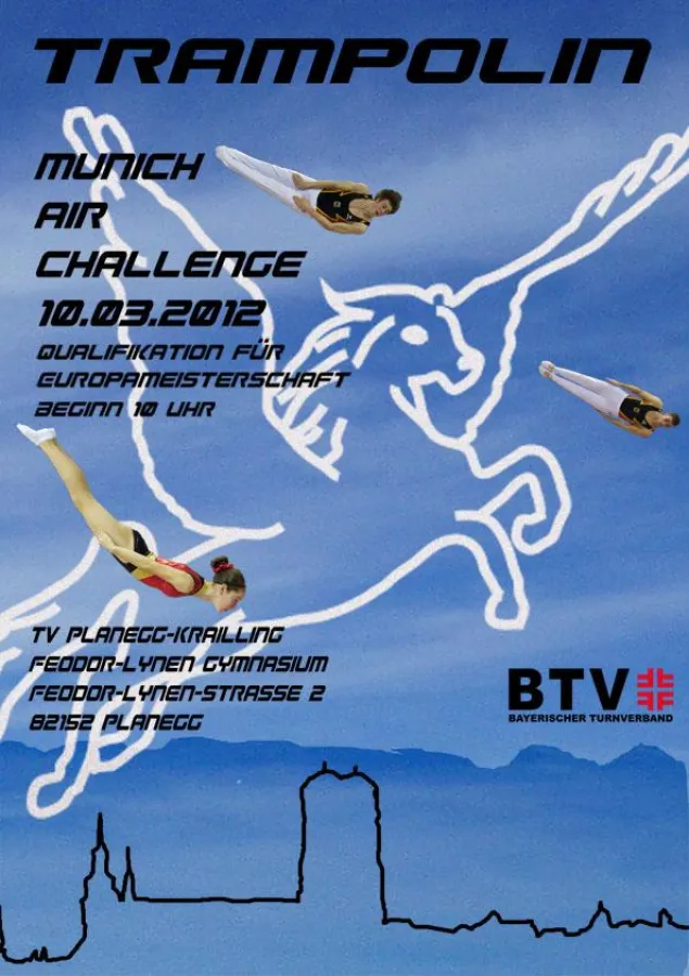 (openPR) Die Topathleten im Trampolinturnen sind am 10. März zu Gast in Planegg. Dort findet die erste Munich-Air-Challenge in der Turnhalle des Feodor-Lynen-Gymnasiums statt. Die rund 90 Sportler aus ganz Deutschland haben bei diesem nationalen Wettkampf die alles entscheidende Möglichkeit, sich ihr Ticket zur Europameisterschaft im April 2012 zu sichern.