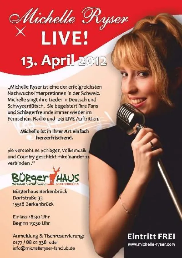 Am Freitag den 13. April trifft sich die Fangemeinde in der Kleinstadt Berkenbrück mit Michelle. An diesem Abend wird Michelle ein Konzert für ihre deutschen Fans geben und mit Norbi und Jana Yngland zwei Gäste an ihrer Seite haben. Spa?, viel Musik und Gute Laune sind da garantiert.