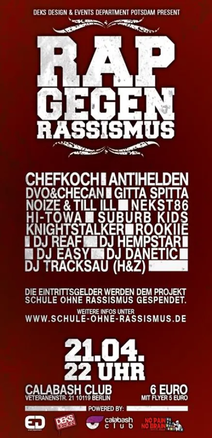Am 21. April 2012 wird im Calabash Club (Veteranenstraße 21 in 10119 Berlin) ab 22:00 Uhr "Rap gegen Rassismus" stattfinden.