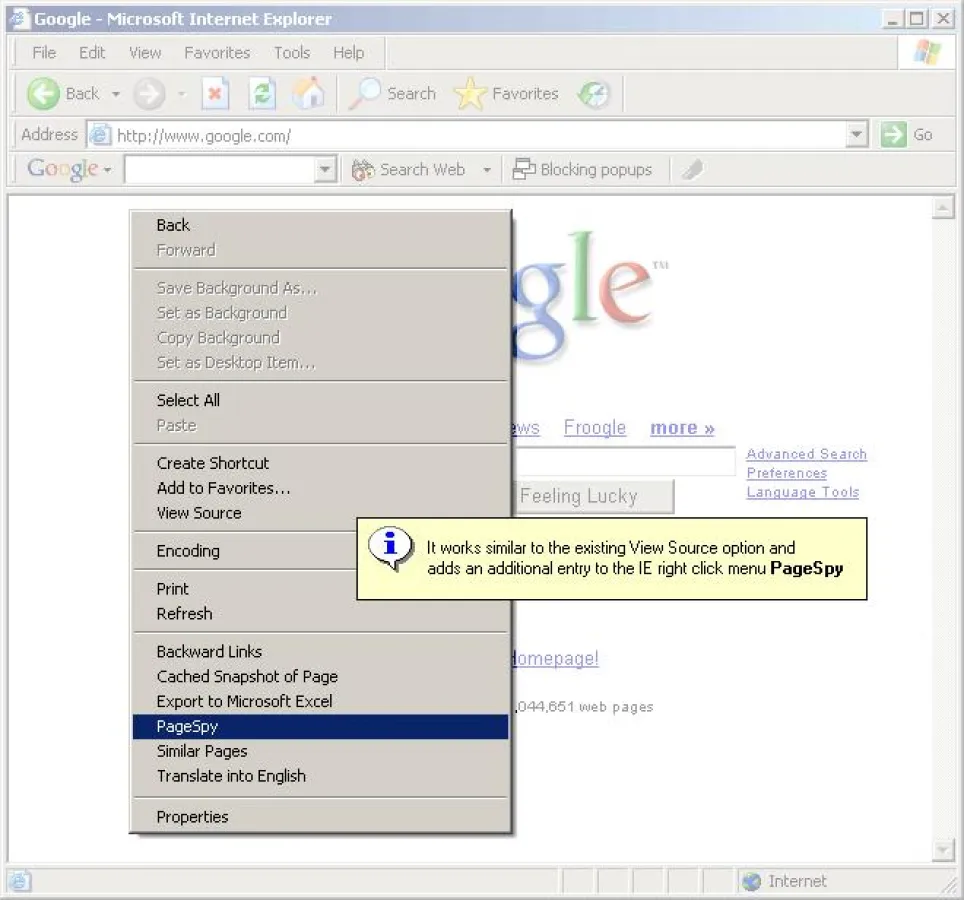 PageSpy klinkt sich bei seiner Installation direkt in das Kontextmenü des Internet Explorers ein. Fortan reicht es aus, eine in den Browser geladene Homepage mit der rechten Maustaste anzuklicken und PageSpy im Kontextmenü auszuwählen. Umgehend analysiert das Tool den Inhalt der Seite im eigenen Fenster.