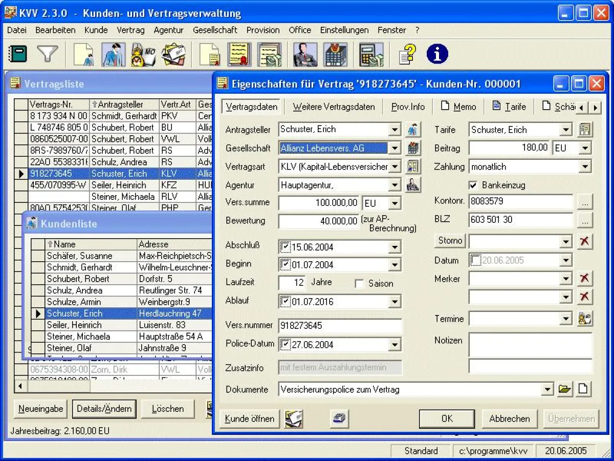 Darüber hinaus bietet das Programm einen GDV- und indatex-Import, eine Änderungs-History für alle Verträge, eine Provisionsübersicht, eine Provisionsabrechnung mit kompletter Stornoverwaltung, einen integrierten E-Mail-Versand und vieles mehr. Im Alltag hat sich KVV für alle Arten von Kfz-, Sach-, Lebens- und Krankenversicherungen bewährt.