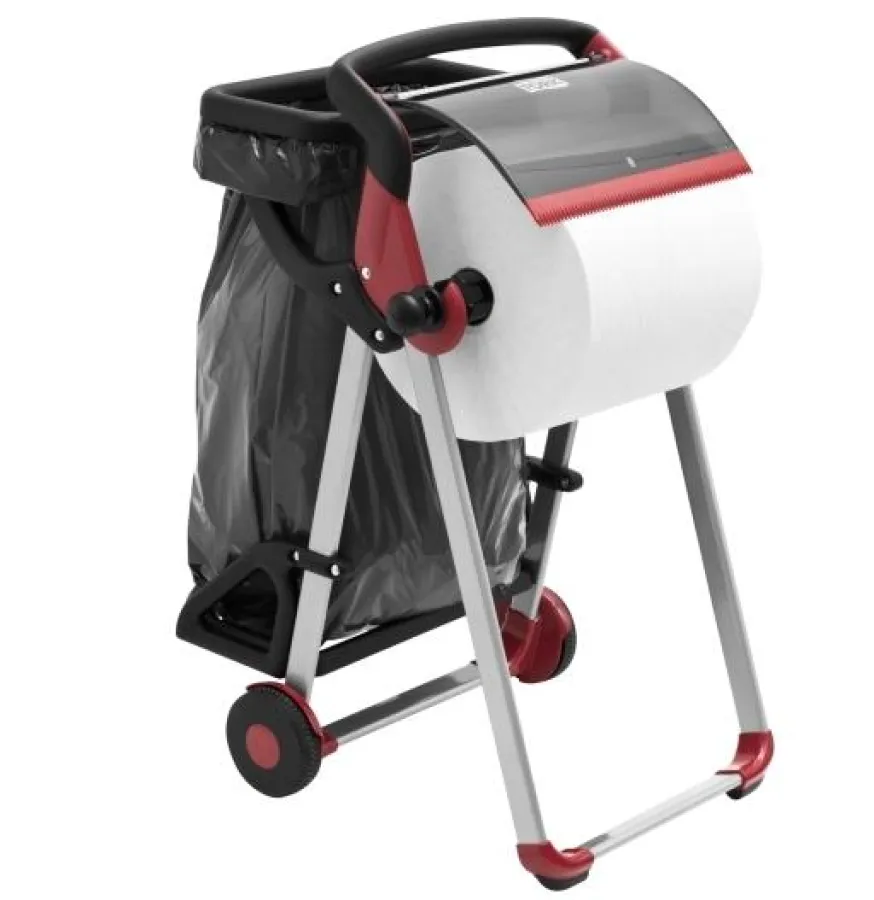 Für einen noch flexibleren Einsatz des Tork Performance Bodenständers sorgt jetzt die Tork Performance Abfallsackhalterung. Der mobile Großrollenspender ist stets dort zur Stelle, wo er benötigt wird: Mit seinem strukturierten, rutschfesten Griff und strapazierfähigen Rädern lässt er sich mühelos zum jeweiligen Einsatzort mitnehmen. Unnötige Wege fallen weg, die Arbeitsabläufe werden optimiert. Jetzt ermöglicht die Tork Performance Abfallsackhalterung noch mehr Effizienz am Arbeitsplatz: Denn die Tücher können dort, wo sie entnommen worden sind, nach Gebrauch wieder entsorgt werden. Dies ist insbesondere dann praktisch, wenn der Bodenständer immer wieder verschoben wird. Für den Nutzer bringt die mobile Abfallsacklösung zwei große Vorteile: Zum einen Zeitersparnis, da zusätzliche Wege zum Entsorgen der Tücher entfallen. Zum anderen hilft die Komplettlösung dabei, Platz zu sparen, da kein separater Abfallbehälter mehr benötigt wird. Das System eignet sich perfekt für den Einsatz in Industrieunternehmen, in Werkstätten und Instandhaltungsfirmen, aber auch in Großküchen und Gastronomiebetrieben.