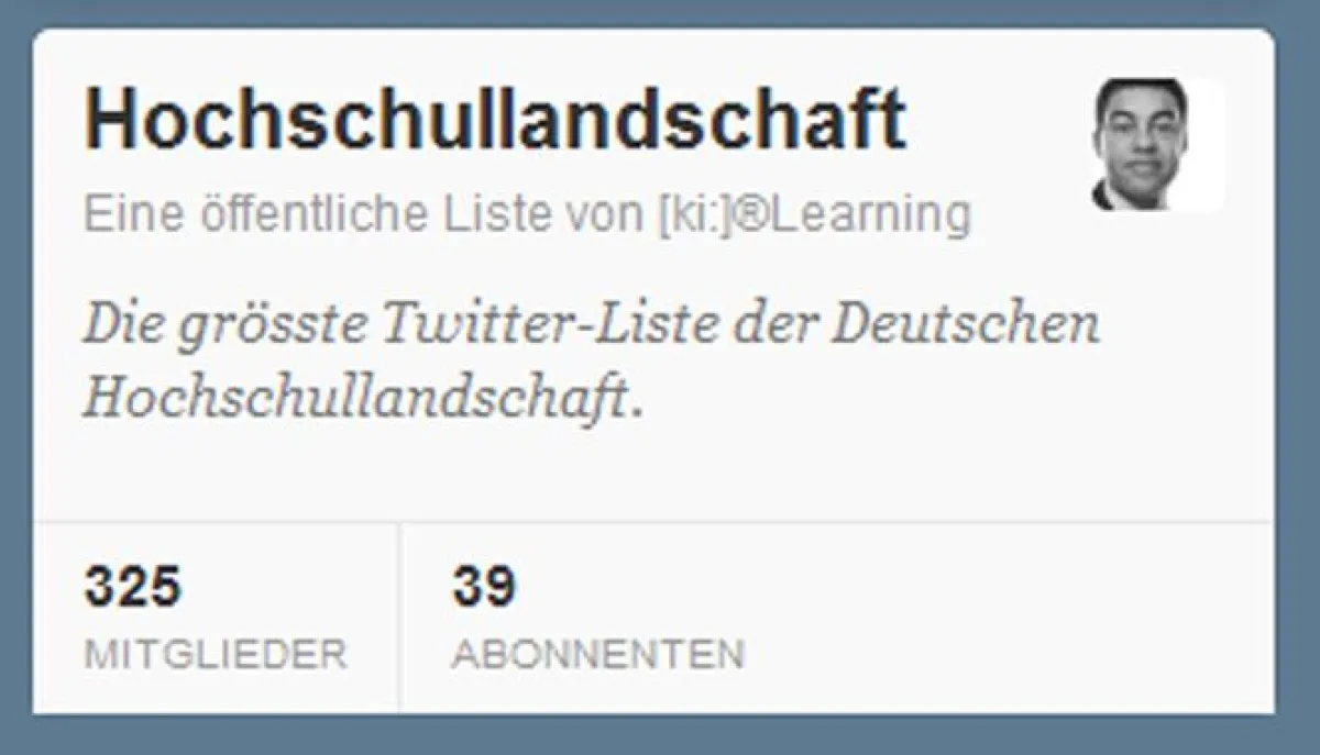 Welche Hochschulen und studentischen Einrichtungen zwitschern, erfahren Sie einfach und bequem über die bisher größte bekannte Twitter-Liste der deutschen Hochschullandschaft. Die "Hochschullandschaft", so heißt die öffentliche Twitter-Liste, zwitschert und verbreitet alle nützlichen Informationen für Studienanfänger und für Studierende hinaus in die Welt. Die öffentliche Auflistung wird von Julian J. Kea und seiner Werkstatt für Beruf, Gründung und Zukunftsgestaltung [ki:]®Learning, gepflegt.