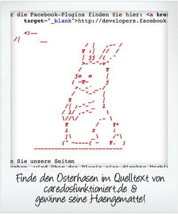 PS: Aufgrund der großen Mediennachfrage hat sich der Osterhase entschieden, ein Versteck hinter der caredosfunktioniert.de-Webseite zu suchen. Spiele Paparazzi, finde ihn im Quelltext und gewinne seine Lieblings-Hängematte!