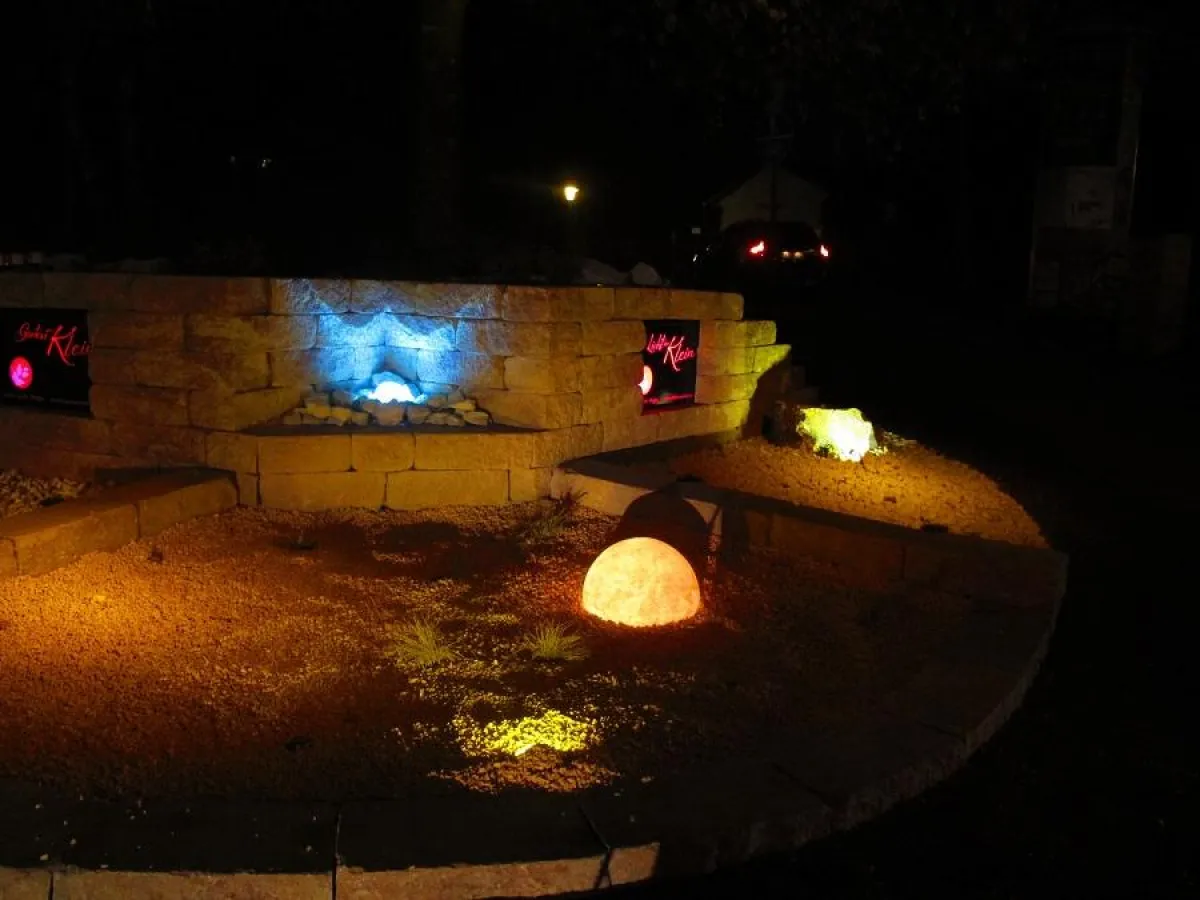 Was aus einem einfachen Vorplatz mit geschickter Lichtinstallation bewerkstelligt werden kann zeigt die Firma Licht von Klein aus Bergisch Gladbach. Verschiedene Steine, dezente Grünflächen und eine atmosphärische Beleuchtung ziehen die Blicke der Passanten in den Bann. Auch die Besucher des Wellness- und Sauna-Bads sind hellauf begeistert.