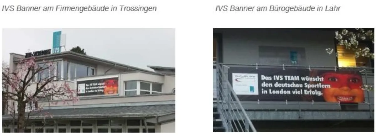Unter dem Motto „Das IVS TEAM wünscht den deutschen Sportlern in London viel Erfolg“ präsentiert sich nun das IVS Banner dem zahlreichen Auto- und Fußgängerverkehr am Ortseingang von Trossingen und im Industriegebiet in Lahr.