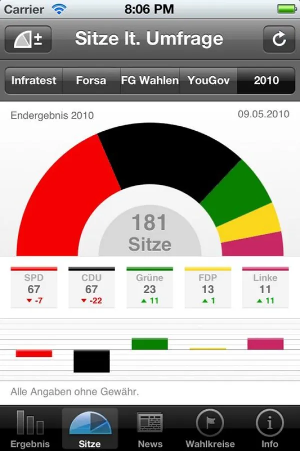Im Ergebnis Teil zeigt die App vor der Wahl die jeweils neuesten Umfrageergebnisse und errechnet dafür bereits die Sitzverteilung. Am Wahlabend werden dort live die ersten Prognosen, Hochrechnungen und schließlich das Endergebnis eingespielt.