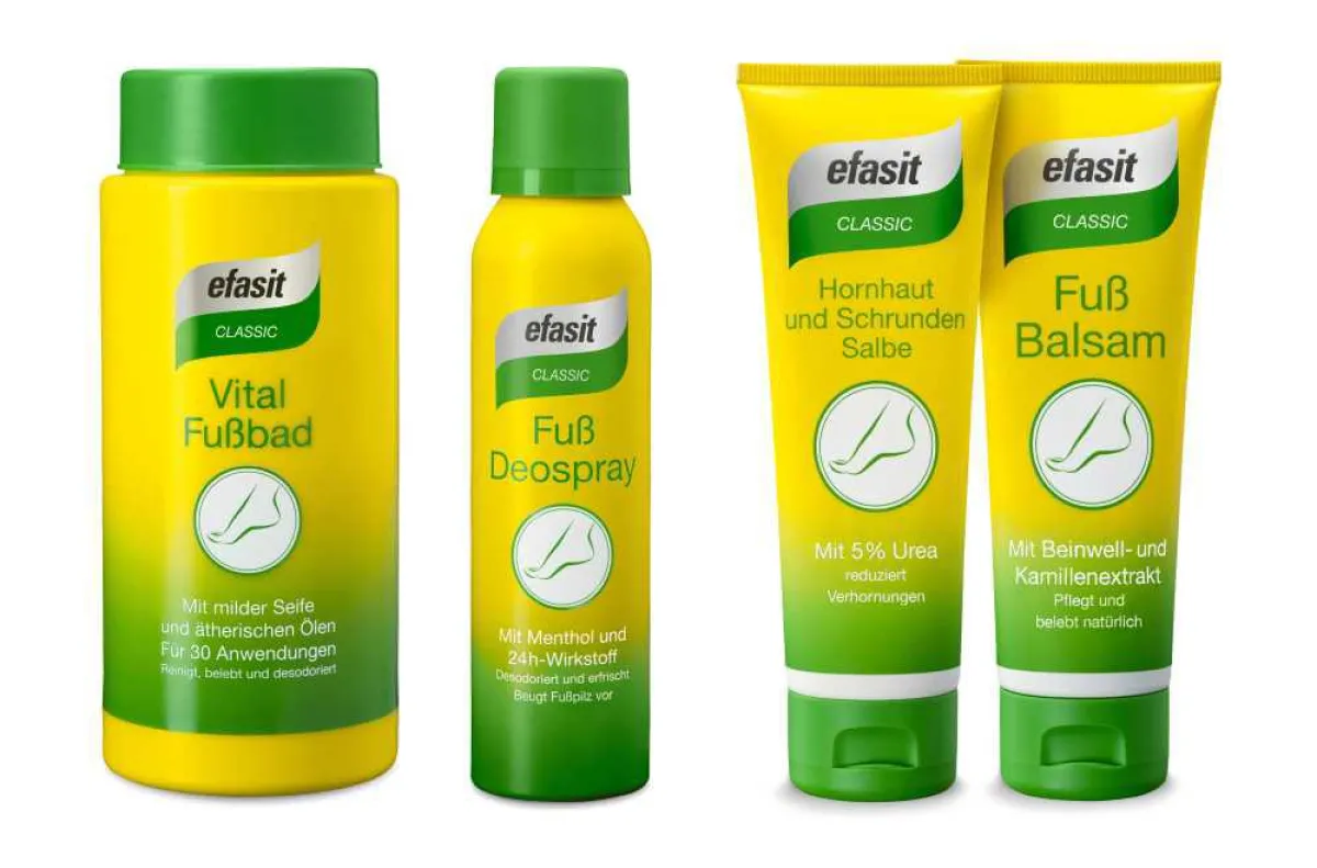 Kaum ein Körperteil wird so sehr unterschätzt wie die Füße. Täglich stellen sie Höchstleistungen auf und sorgen für Stütze, Gleichgewicht und Beweglichkeit. Für gesunde Füße ist eine optimale Pflege daher empfehlenswert. Das efasit Pflegesystem (u.a. in Apotheken und bei Rossmann erhältlich) bietet Füßen alles, was sie für ihr Wohlergehen und ein perfektes Erscheinungsbild brauchen. Es wurde speziell für die tägliche Anwendung entwickelt und wird mit seinen maßgeschneiderten, dermatologisch getesteten Pflegeprodukten jedem Fußtyp gerecht. Von Bädern über Cremes bis hin zu Deodorants: Bei den efasit classic Produkten ist garantiert für Jeden das Richtige dabei.