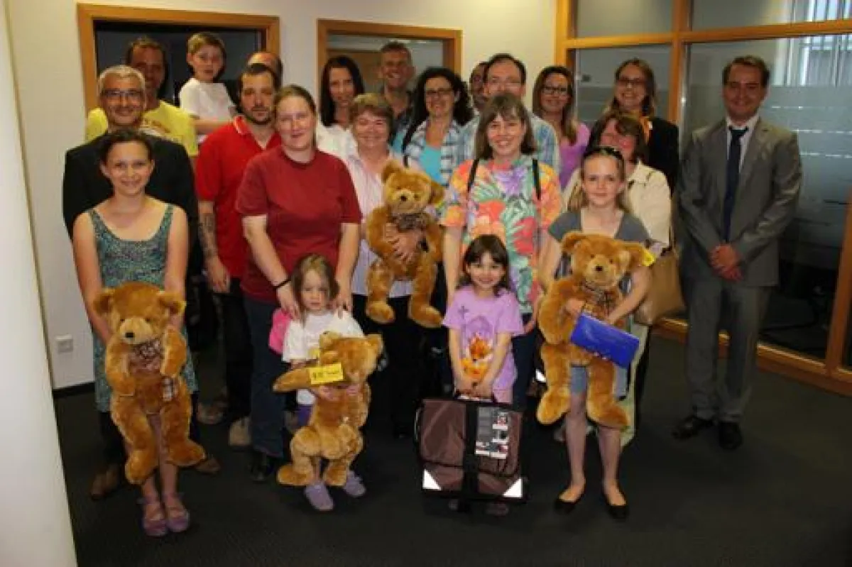 Sie und 11 andere Teilnehmer, die eine leicht abweichende Schätzung abgaben, wurden als Gewinner zur Preisübergabe eingeladen. Die Mitarbeiter der Geschäftsstelle in Karlsdorf begrüßten am 22.05.2012 die großen und kleinen Gewinner mit einem Getränkeempfang. Die Erwachsenen freuten sich über eine Travelmate Reiserolltasche, die Jugendlichen über einen flauschigen Riesenbär.