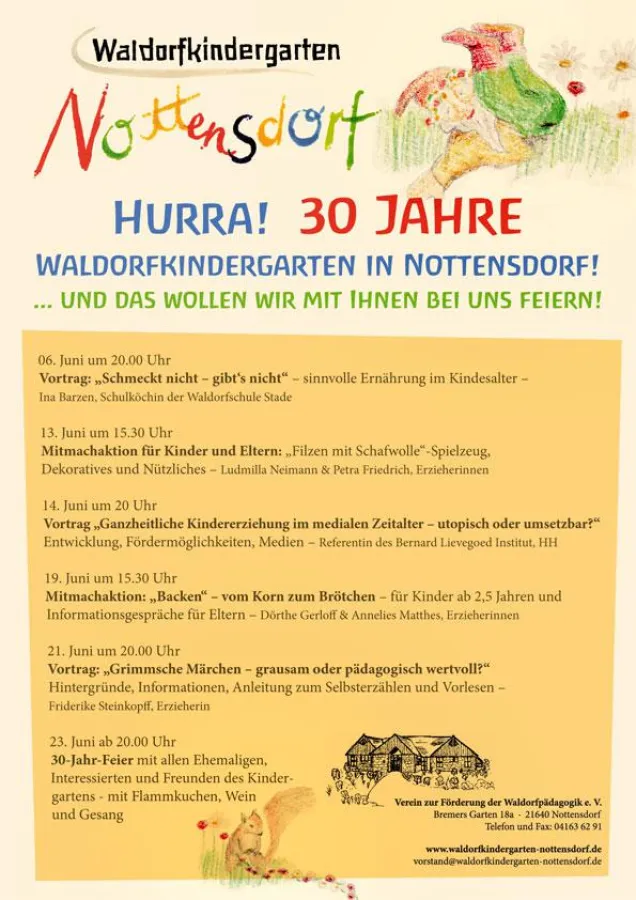 Eine ganzheitliche Förderung und Erziehung Ihrer Kinder liegt Ihnen am Herzen ? Dann verspricht die Waldorfpädagogik eine Alternative zur Regelschule und dem traditionellen Kindergarten zu sein. Die aktive Einbeziehung des ganzen Menschen in das Erwachsenwerden, eigene Motivation und altersgerechter Lernstoff an Stelle von Leistungsdruck und dennoch am Ende der Waldorflaufzeit umfassend gebildete selbstbewusste junge Erwachsene mit gutem Schulabschluss. Das versprechen engagierte Waldorfpädagogen, und viele Erfolge geben ihnen Recht. Allerdings gibt es auch noch viel Unbekanntes, Klischees und Vorurteile gegen die alternative Methode, die schon im Kindergarten beginnen kann. Um hier zu informieren, haben nun die Erzieherinnen, engagierte Eltern und der Vorstand des Kindergartens in Nottensdorf anläßlich des 30jährigen Bestehens eine Veranstaltungsreihe zusammengestellt, die auf offene Fragen interessierter Eltern eingeht.