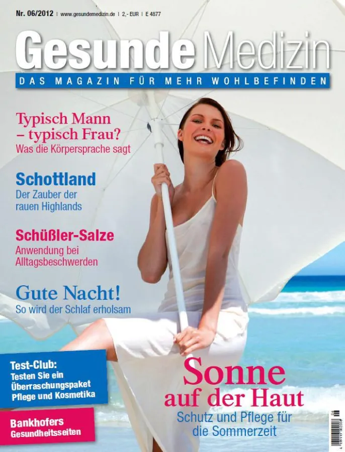 Weitere Themen im Heft sind unter anderem „Sonne auf der Haut – Schutz und Pflege für die Sommerzeit“, „Schüssler Salze – Anwendung bei Alltagsbeschwerden“ und „Typisch Mann – typisch Frau? Was die Körpersprache sagt“.