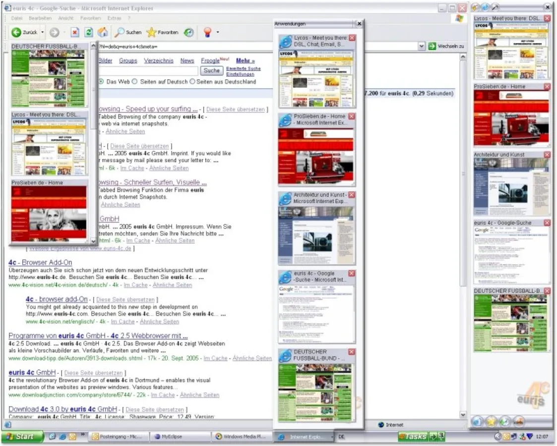 Ist 4c aktiv, startet eine spezielle Fensterverwaltung, sobald zwei Browser-Fenster geöffnet werden. In der Fensterverwaltung sind Vorschaubilder auf alle Browser-Instanzen zu sehen. Auch hier reicht ein Mausklick aus, um die gewünschte Seite auf dem Schirm nach vorne zu holen. Kai Bonfigt von der euris 4C GmbH: „Das parallele Surfen im Internet mit mehreren Browser-Fenstern wird so endlich zum Kinderspiel.“