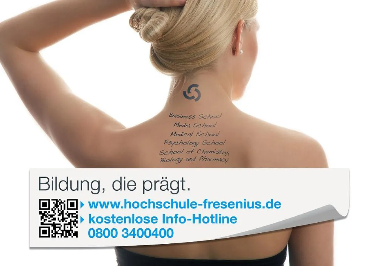 Das Motiv zeigt den freien Rücken einer Frau, in den die neuen Schools der Hochschule Fresenius eintätowiert sind. Mit den Schools etabliert die Hochschule Fresenius eine kommunikative Neuausrichtung. Die Schools ersetzen nicht die Fachbereiche, sondern dienen dem Hochschulmarketing dazu, die in den vergangenen Jahren stark angewachsene Anzahl von Studienangeboten des Hauses transparenter und fokussierter präsentieren zu können und den Anforderungen der Studieninteressenten gerechter zu werden.