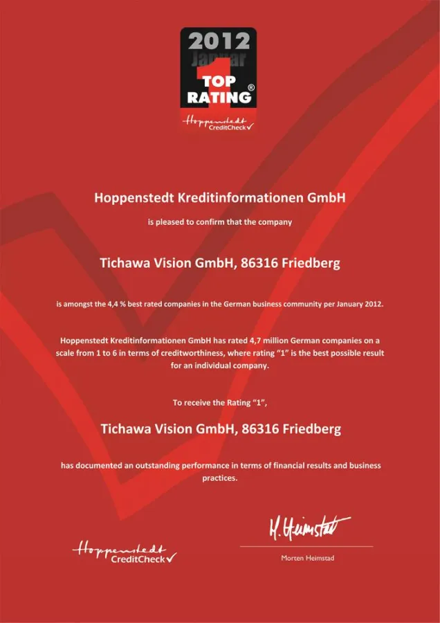 (openPR) Tichawa Vision GmbH als vertrauenswürdiger Geschäftspartner bestätigt Friedberg, 14. Juni 2012. Die Tichawa Vision GmbH aus Friedberg, der Spezialist für die Herstellung hochpräziser CIS-Contact Image Sensoren für die industrielle Produktkontrolle, wurde für das Jahr 2012 erneut mit dem TopRating des Wirtschaftsauskunftsdienstes Hoppenstedt CreditCheck ausgezeichnet. Damit gehört Tichawa Vision zu den exklusiven 4,4 Prozent bestbewerteter deutscher Unternehmen, die eine erstklassige Bonität und Zahlungstreue aufweisen.