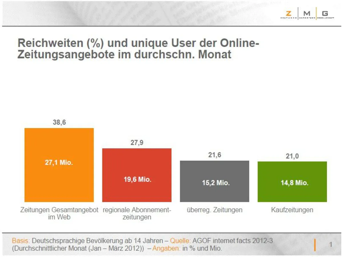 Frankfurt/Main, 26. Juni 2012. - Die Zeitungen erreichen mit ihren Web-Angeboten zwei von fünf (38,6 Prozent) Deutschen. Das entspricht einer Reichweite von 27,1 Millionen Unique Usern im durchschnittlichen Monat (Januar bis März 2012). Damit stellen die Zeitungen in ihrer Gesamtheit weiterhin das reichweitenstärkste Angebot im Internet – vor T-Online und eBay.