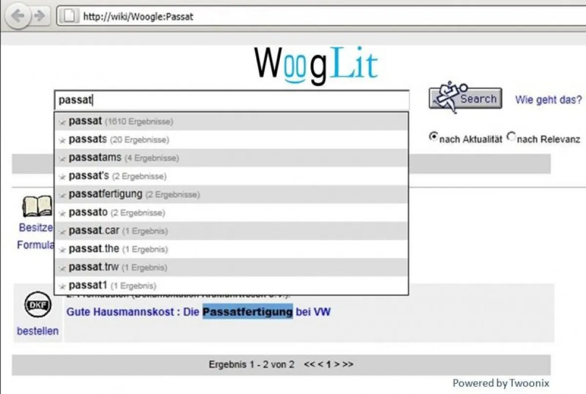 Die TWOONIX hat ihre herausragende Wikitechnologie nun so erweitert, dass es jetzt auf Basis der Woogle-Suche im Semantic MediaWiki möglich ist, beliebige Seiten, aber auch Dokumente inklusive deren Inhalt so zu suchen und zu finden, wie man es von der Suchmaschine Google gewöhnt ist. Sie finden Dateien, Präsentationen oder informative Wikiseiten in ihrem internen Wiki, Intranet-System oder beliebigen Webservern im Intra- und Internet, die sie einstellbar absuchen können.