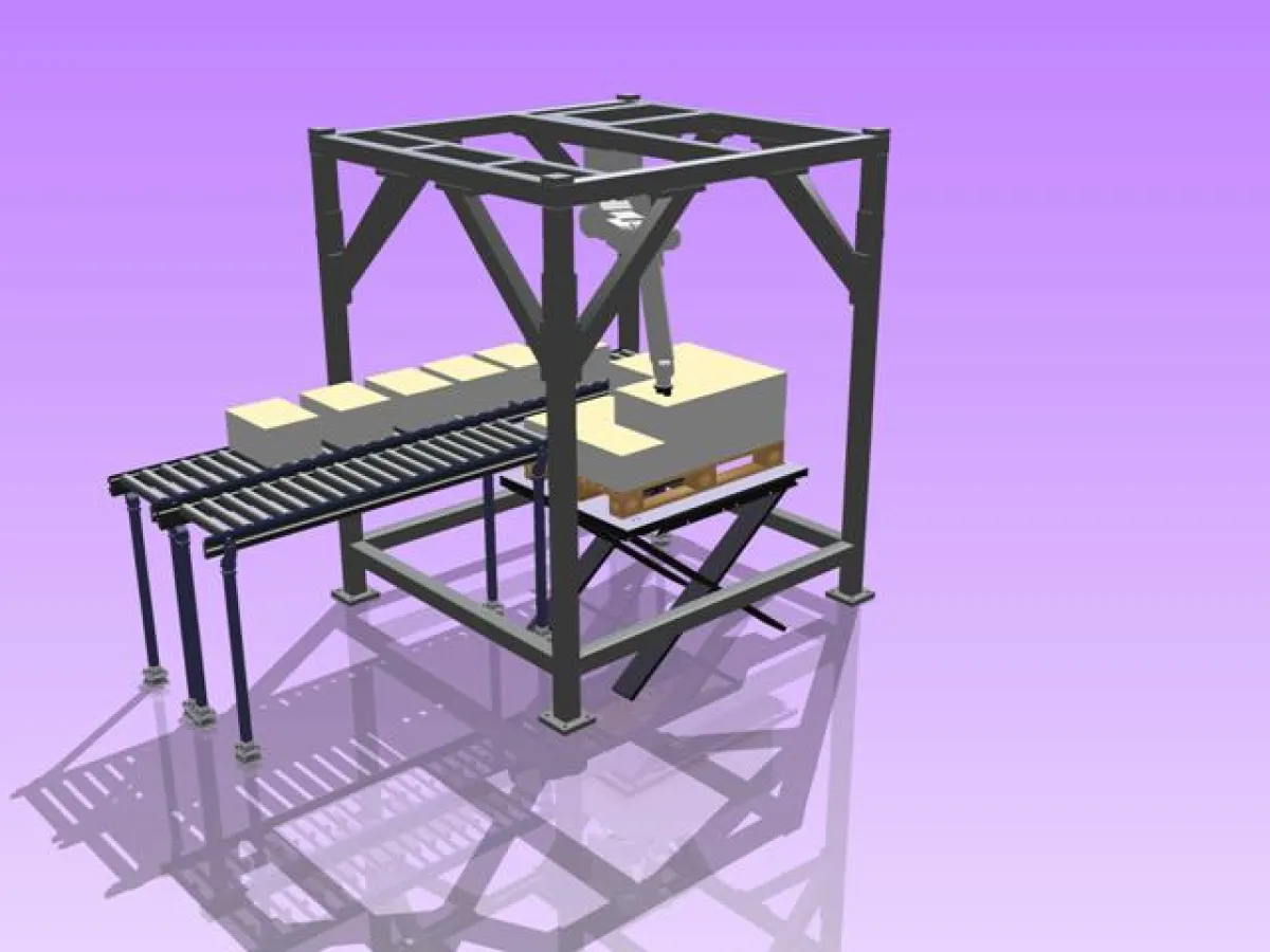 Auf einer Standfläche von max. ca. 3 m x 3 m lassen sich sowohl die ein-, als auch die zwei Roboter Variante unterbringen. Der Roboter hängt dabei kopfüber in einem Gestell und palettiert Pakete saugend von einem laufenden Förderband auf eine bereitgestellte Europalette. Eine schonende Behandlung der Pakete ist dabei durch den Sauggreifer garantiert (wahlweise auch andere Greiferkonzepte möglich). Zudem können selbst unterschiedlichste Lagenbilder durch einfache Programmanpassungen realisiert werden, wodurch Umrüstzeiten optimiert werden oder sogar komplett entfallen. Um die Taktzeit sowie die Roboterbewegungen zu optimieren ist in den Prozess ein Hubtisch integriert, der die Ablageposition auf der Palette immer in gleicher Höhe hält und Lagenweise taktet.