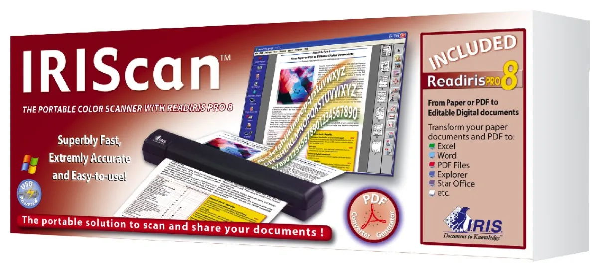 Die neue Paketlösung von I.R.I.S. kombiniert den tragbaren A4-Farbeinzugsscanner IRIScan mit der Texterkennungssoftware Readiris Pro 9, die erstmals als hybride Version sowohl unter verschiedenen Windows- als auch Mac OX-Betriebssystemen einsetzbar ist.
