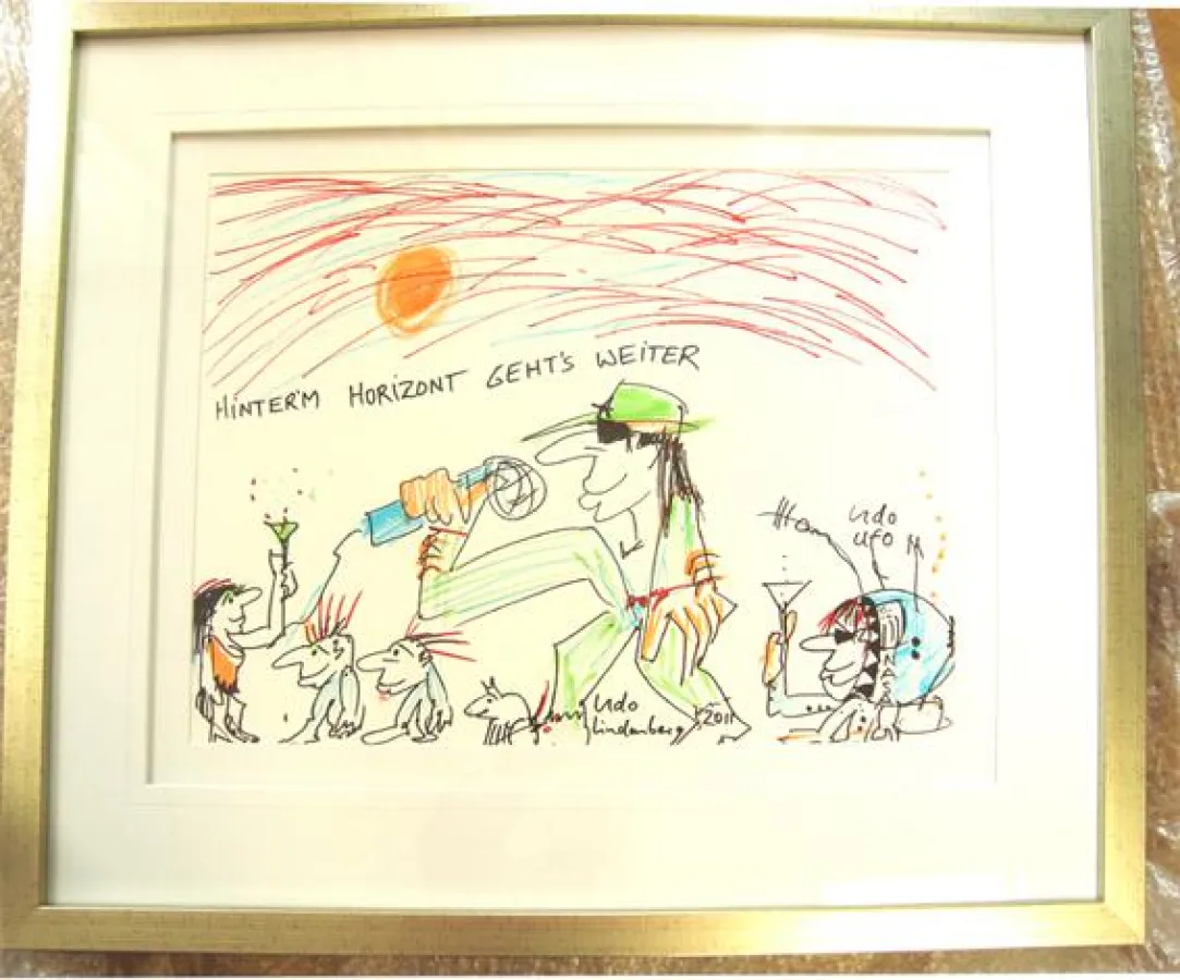 Das Kunstwerk "Hinterm Horizont geht's weiter" ist eine Schenkung Udo Lingenbergs an den Ambulanten Hospizbewegung Münster e.V. anlässlich seines 20-jährigen Jubiläums. Das Bild hat die Maße 56,0 x 40,8 cm, gerahmt ist es 69,3 x 82,3 cm groß. Für die Gestaltung verwendete der Sänger Fasermalstifte und Markerstifte.