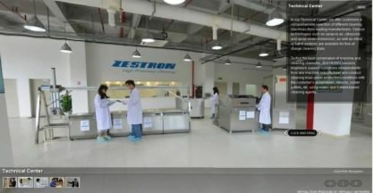 Darüber hinaus erhalten Kunden Zugang zu ZESTRON’s Analytik Zentren, die nach den durchgeführten Reinigungsversuchen für die Oberflächenqualifikation zu Verfügung stehen. Ferner ist ein 360°-Rundgang durch die Ausbildungs- und Videokonferenzräume möglich. Zusätzliche Textboxen liefern außerdem spezifische Informationen zu den einzelnen Abteilungen. Alle virtuellen Touren lassen sich mittels Maussteuerung leicht und intuitiv bedienen.