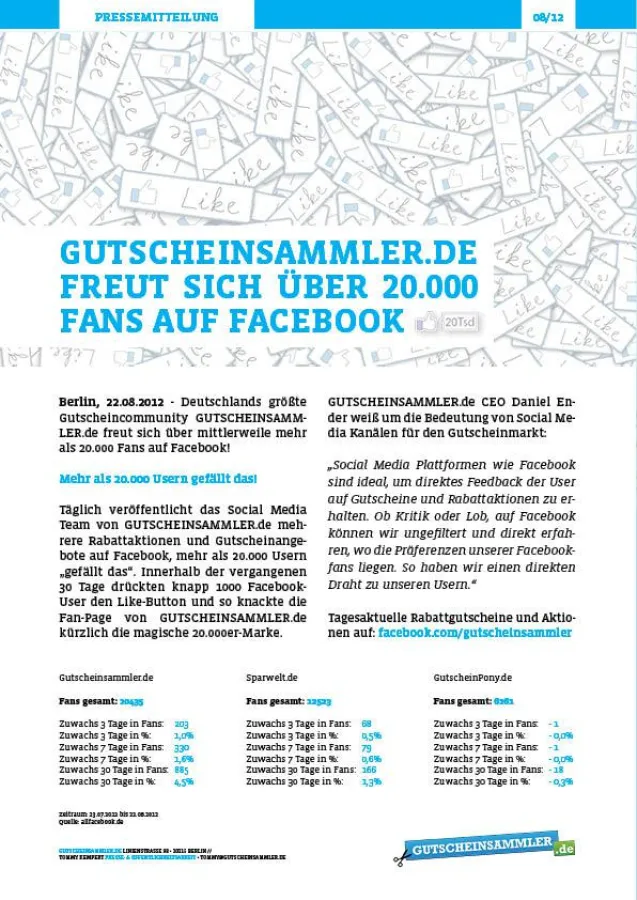 Link zur Pressemitteilung: http://www.gutscheinsammler.de/pressecenter/gutscheinsammler-de-freut-sich-uber-20-000-fans-auf-facebook/