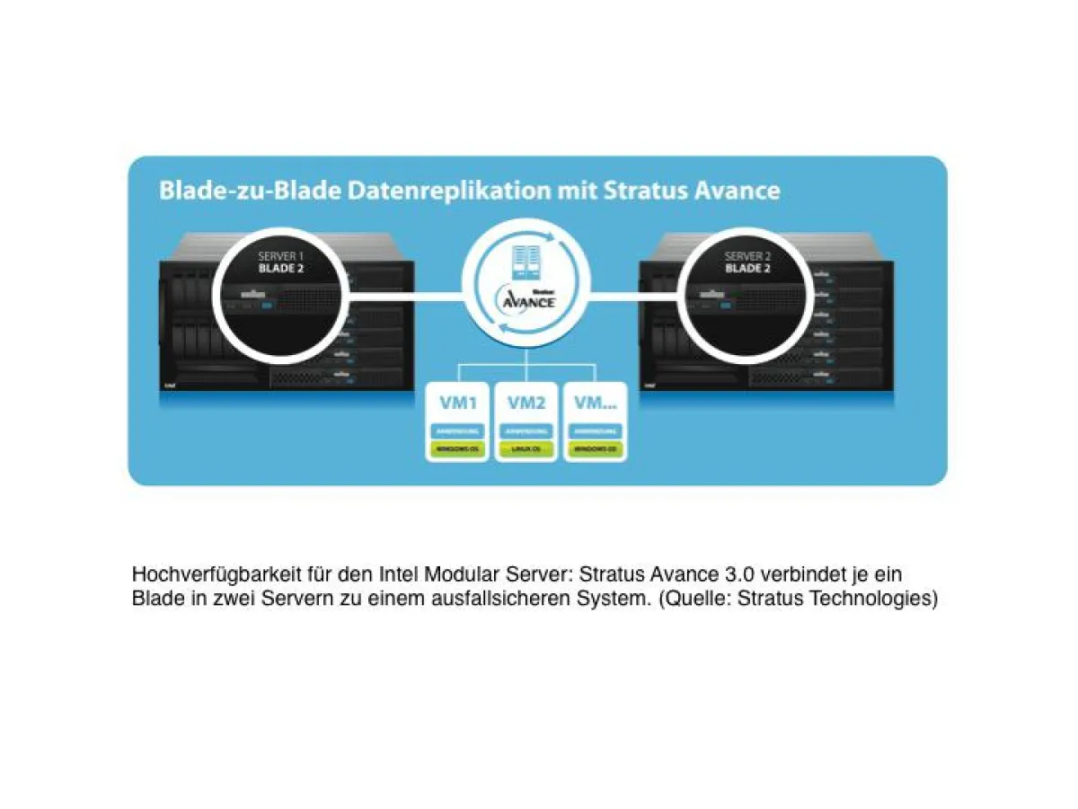 Mit Stratus Avance 3.0 und dem Intel Modular Server können Unternehmen Leistungsfähigkeit, Skalierbarkeit und Flexibilität ihrer ausfallsicheren Systeme erheblich steigern. Stratus Avance 3.0, die softwarebasierte Hochverfügbarkeitslösung von Stratus, verbindet je ein Blade in zwei Servern zu einem ausfallsicheren System. Der Intel Modular Server kann in einem Servergehäuse bis zu sechs Serverblades aufnehmen; Stratus Avance kann daher in einem Gesamtsystem bestehend aus zwei Gehäusen mit bis zu sechs Server-Paaren betrieben werden.