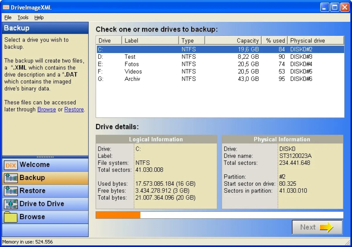 Die einfach zu bedienende Software fertigt einen Backup von einer Partition oder einem logischen Laufwerk an. Dabei nutzt „DriveImage XML 1.0“ ggf. die Microsoft Volume Shadow Services (VSS), um ein Image auch von Laufwerken ziehen zu können, die zurzeit noch im Betrieb sind. Anders wäre es nicht möglich, die aktive Windows-Partition zu sichern.