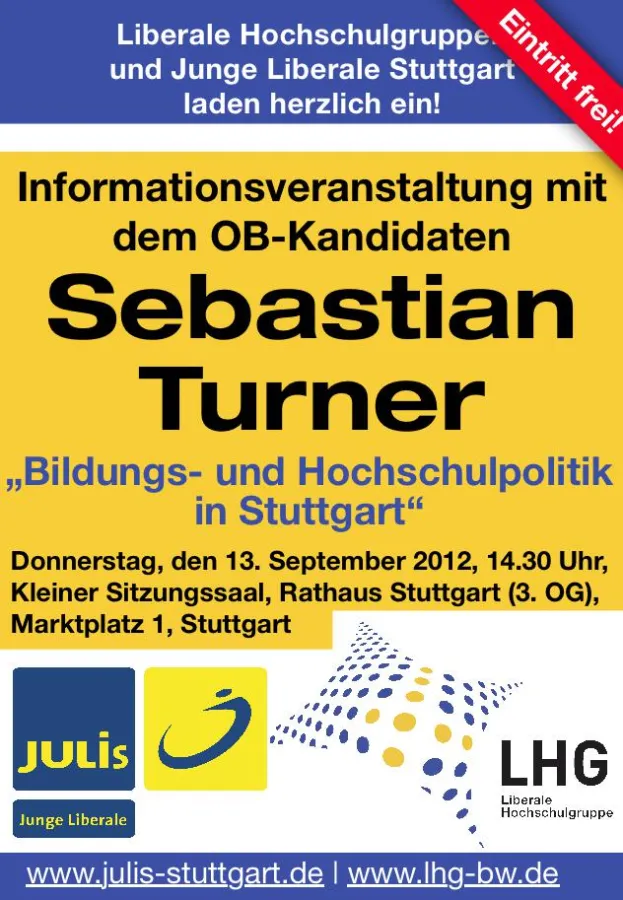 Am 7. Oktober wird in Stuttgart ein neuer Oberbürgermeister gewählt. Die FDP unterstützt zusammen mit der CDU und den Freien Wählern den Kandidaten Sebastian Turner, einen Unternehmer, der sich für ein modernes, weltoffenes Stuttgart einsetzt, wie seine Wahlwerbung verheißt. Zwei Themen, die ihm und uns besonders am Herzen liegen, sind die Bildungs- und die Hochschulpolitik. Hierüber möchten wir mit ihm diskutieren.