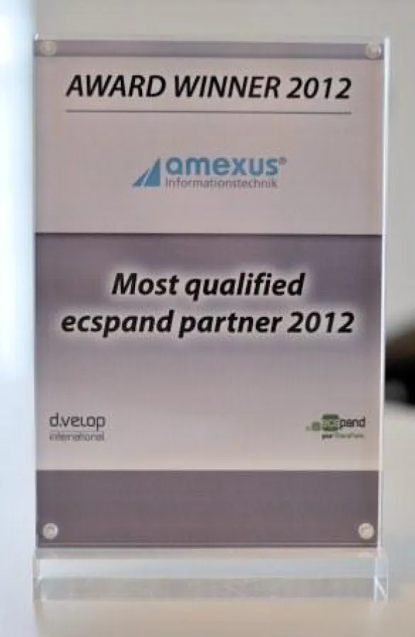 In einer außergewöhnlichen und mit dem red dot design award ausgezeichneten Location, dem Upside East in München, fand in diesem Jahr die ecspand Partnerworld statt. ecspand Partner aus Europa und den USA informierten sich in diversen Workshops und Vorträgen über die neuesten Entwicklungen im Bereich Enterprise Content Management und SharePoint. Im Rahmen der Veranstaltung wurde die amexus Informationstechnik aus Ahaus mit dem „Most qualified ecspand partner 2012“ Award ausgezeichnet. Dieser Award wird für außergewöhnlich gute Leistungen in der Realisierung von ecspand ECM Projekten vergeben und zeichnet damit insbesondere das Know How der Consultants des Unternehmens aus. Dementsprechend nahm Stefan Nacke, Geschäftsführer der amexus Informationstechnik, den Preis gerne entgegen: „ Ich freue mich, stellvertretend für unser Consulting Team, diesen Award entgegen nehmen zu dürfen. Diese Auszeichnung bestätigt uns in unserer Strategie qualitativ hochwertige Lösungen zu realisieren.“ Die ecspand Partnerworld wird jährlich einmal durchgeführt und ist die Plattform für den Austausch der Partner untereinander.