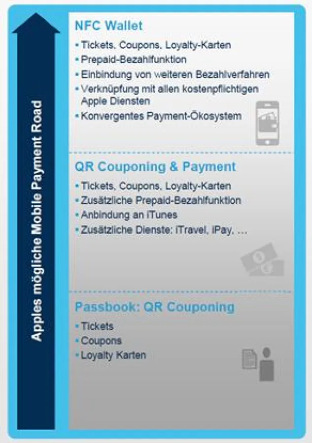 Apple könnte mit Passbook einen schrittweisen Einstieg in den mobilen Payment Markt verfolgen. Da bis zur Marktreife der NFC-Technologie noch massive Investitionen in Infrastruktur und Kundenakzeptanz notwendig sind, setzt Apple auf die schon heute weit verbreiteten QR-Codes. Passbook dient dabei der Heranführung der Kunden an mobile Bezahlverfahren und könnte in den nächsten Schritten voraussichtlich zu einer Mobile Wallet mit Bezahlfunktion ausgebaut werden. Im Gegensatz zu anderen Wettbewerbern fokussiert sich Apple nicht nur auf die Digitalisierung des Geldes, sondern kreiert erst einmal ein Ökosystem zur Digitalisierung aller Bestandteile der Geldbörse jenseits des Geldes. Diesmal kommt der disruptive Ansatz von Apple subversiv daher.