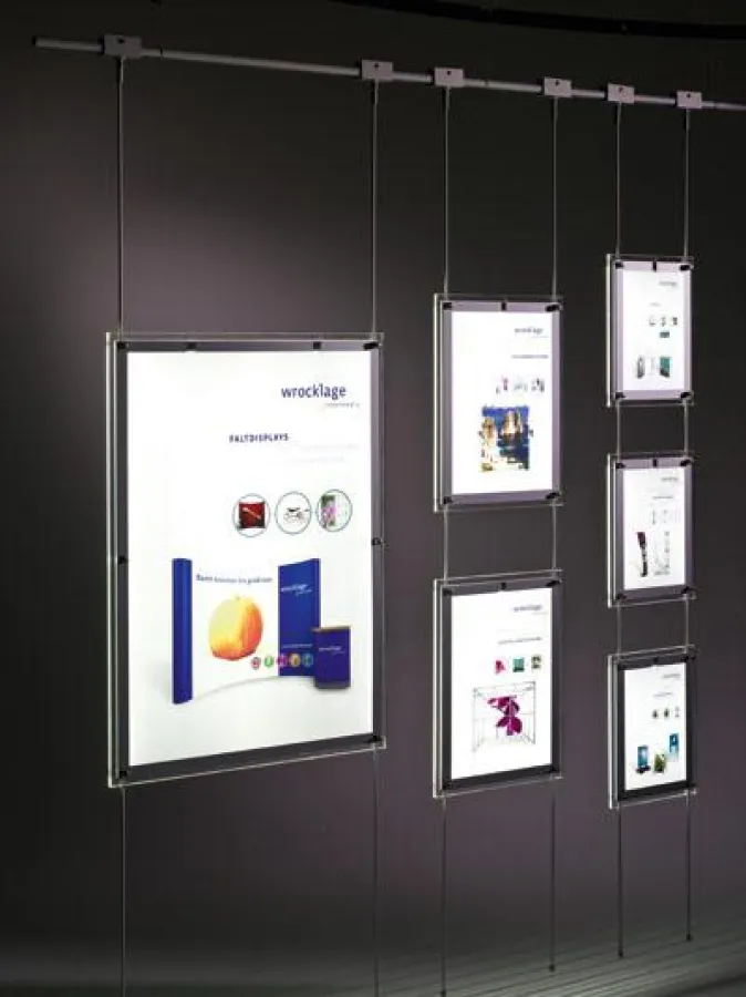 Durch seine Systembauweise ist das komplette System äußerst flexibel. Die LED Displays sind in den Formaten DIN A1, A3 und A4 verfügbar, weitere Formate können kundengerecht entwickelt werden. Die Displays werden individuell an einem eleganten, zeitlosen Aluminiumgestänge befestigt und lassen sich jederzeit neu zusammenstellen und arrangieren. Durch den cleveren Kippmechanismus der Lotstangen bleibt sowohl das System als auch das gesamte Schaufenster leicht zu reinigen.