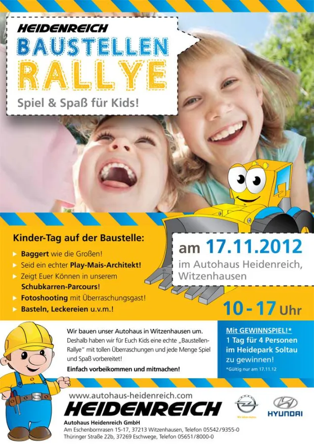 „Unbefugten ist das Betreten der Baustelle streng verboten!“ heißt es ja bekanntlich. Das Autohaus Heidenreich in Witzenhausen macht am 17. November diesbezüglich eine Ausnahme und lädt alle Kinder aus dem Umkreis und deren Eltern herzlich zur Baustellen-Rallye nach Witzenhausen ein. In der Zeit von 10 bis 17 Uhr verwandelt sich die Heidenreich-Baustelle in einen bunten Baumeister-Parcours, bei dem die kleinen Baustellenbesucher ihr Talent als Playmais-Architekten, Schubkarren-Fahrer und Fotoshooting-Stars unter Beweis stellen können.