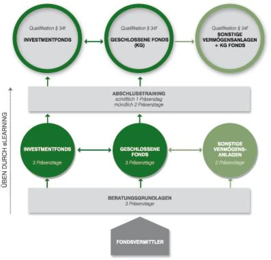 Beispiel: Ein Vermittler, der bereits Versicherungsfachmann (IHK) ist oder eine Erlaubnis gem. §34d GewO hat (somit von der mündlichen Prüfung nach § 34 f befreit ist) und ausschließlich Investmentfonds vermitteln möchte, braucht somit nur 7 Seminartage, um sich auf die IHK-Prüfung vorzubereiten. Sollte er alle drei „§ 34f-Gewerbeerlaubnisse“ anstreben, so wären es insgesamt nur 14 Präsenztage.