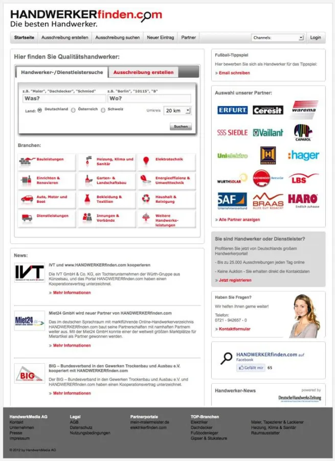 (openPR) Der SAF Unternehmensverbund hat mit „HANDWERKERfinden.com“ einen neuen Kooperationspartner gewonnen: HANDWERKERfinden.com ist eine der führenden Plattformen für Handwerker unterschiedlicher Bereiche sowie für Bauherren. Betrieben wird das Portal von der HandwerkMedia AG mit dem Ziel, neue Kunden an seine Mitglieder zu vermitteln. www.HANDWERKERfinden.com ermöglicht die geographische Suche von Handwerkeradressen im Internet, wobei der Nutzer der Webseite aus verschiedenen Gewerken Informationen abrufen kann. HANDWERKERfinden.com vermittelt dabei Qualitätsbetriebe mit entsprechender Kennzeichnung. Ebenso können Handwerksleistungen angeboten und Ausschreibungen veröffentlicht werden.