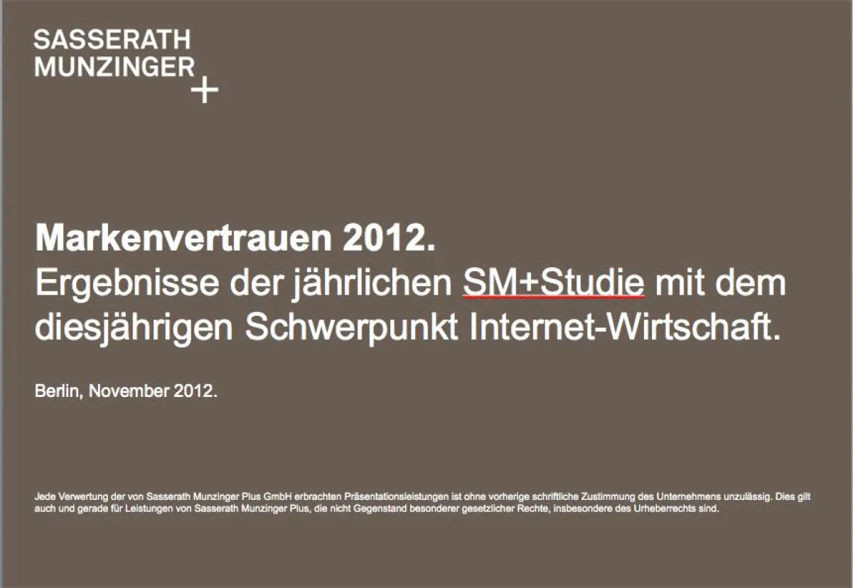 Dies sind die Kernergebnisse der 5. repräsentativen Studie zum Thema Markenvertrauen. Dazu wurden im Oktober 2012 1000 Deutsche repräsentativ per Online-Erhebung von Sasserath Munzinger Plus, der Berliner Gesellschaft für Markenberatung und Markenentwicklung, befragt.