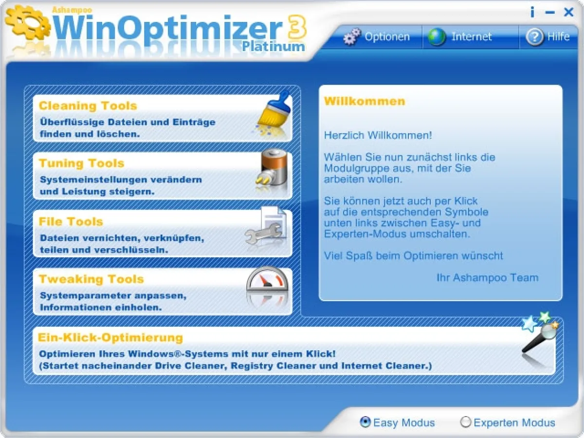 Der neue Ashampoo WinOptimizer Platinum 3 enthält die bereits zu Klassikern gewordenen Reinigungs- und Tuning-Module, eine Reihe nützlicher Werkzeuge zum sicheren Arbeiten mit Dateien und eine Reihe neuer Features, mit denen die Optimierung von Windows in eine neue Dimension vorstößt.