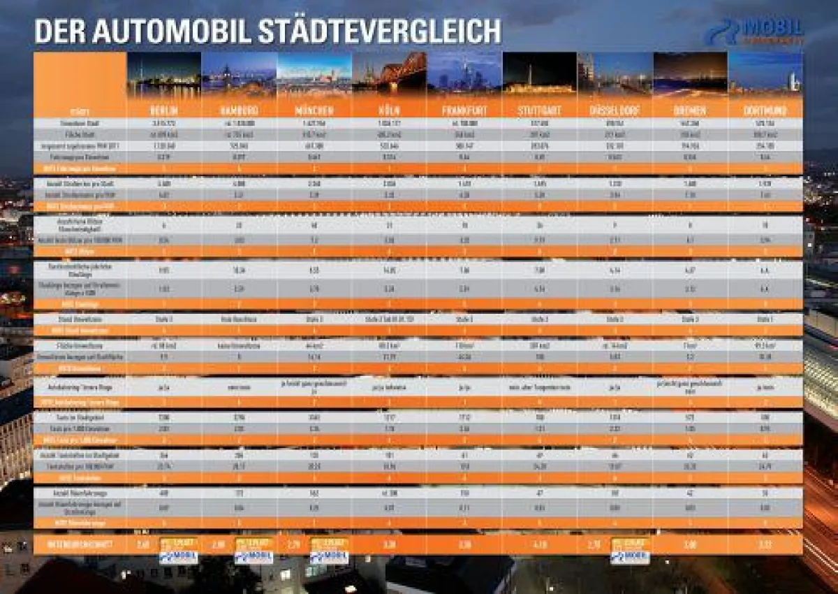 Doch wie ist der Alltag in den deutschen Städten? Wie gut kommen ihre Bewohner von A nach B? Wie sehr sind sie genervt von Stau oder unsinnigen Geschwindigkeitskontrollen? Wird der Individualverkehr gefördert oder behindert? Mobil in Deutschland e.V., Deutschlands junger Automobilclub, hat seinen zweiten Städtevergleich aufgestellt. Anhand zahlreicher Kriterien und mithilfe vieler freundlicher Mitarbeiter in den städtischen Behörden hat der junge Automobilclub herausgefunden: Jede Stadt tickt in Sachen Mobilität anders.