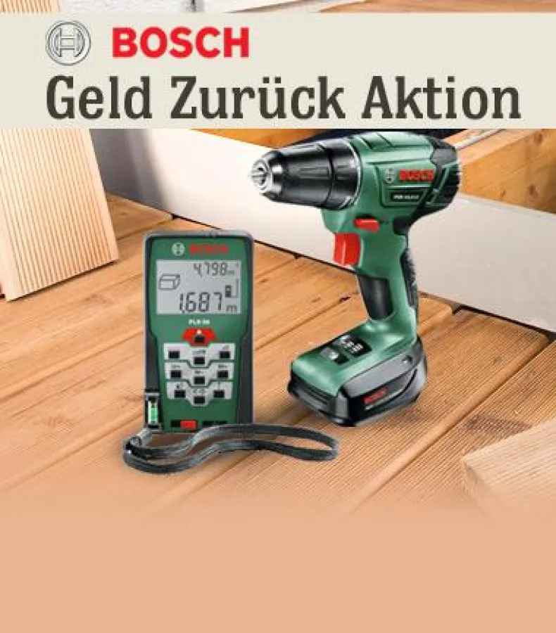 Die Bosch Aktion ist nicht mit anderen Aktionen oder Bosch Gartengeräten kombinierbar. Diese Aktion gilt nur für die an der Aktion teilnehmenden Produkte der grünen Elektrowerkzeuge von Bosch für Heimwerker inklusive digitaler Messwerkzeuge. Einsendeschluss ist zwei Wochen nach Kauf des Elektrowerkzeuges.