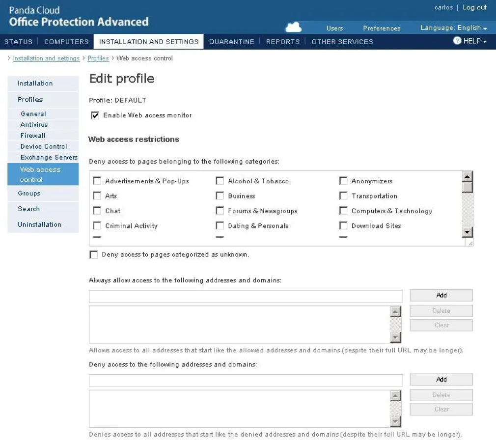 • URL-Filter: Optimierte, proaktive Erkennung für einen besseren Schutz. Anhand der integrierten Technologien sowie der Reporting-Funktionalitäten wird ein sicheres Surfen ermöglicht. Zusätzlich sind Administratoren damit in der Lage, Blacklisten und Whitelisten nach URLs zu erstellen und den Zugriff auf Webseiten, die zu unzulässigen Kategorien gehören (wie Sport, Sex, Spiele, etc. - entsprechend den Einstellungen), zu verhindern.