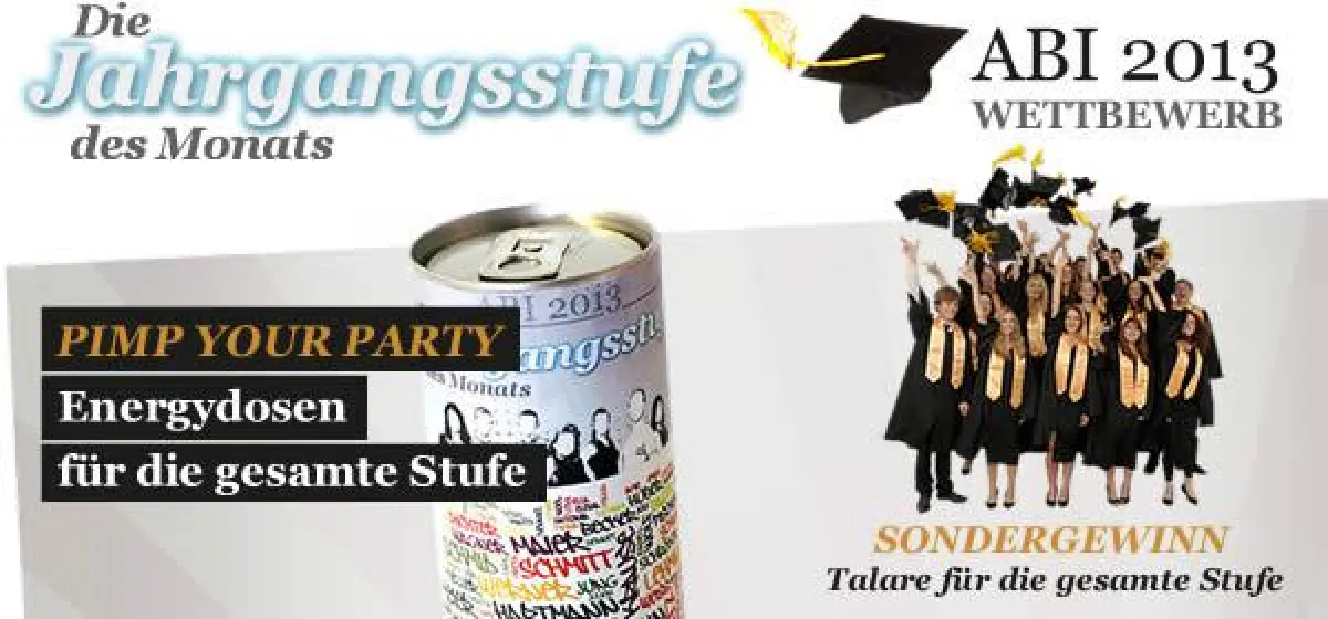In dem Wettbewerb „Jahrgangsstufe des Monats“ suchen Abschlusszeit und duales-studium.de die Abschlussklasse des Monats. Alle Jahrgangsstufen, die im Jahr 2013 ihr Abitur machen, haben die Chance auf einen Druckgutschein für die Abizeitung und auf zwölf Paletten ihres einzigartigen und individuellen Energydrinks.