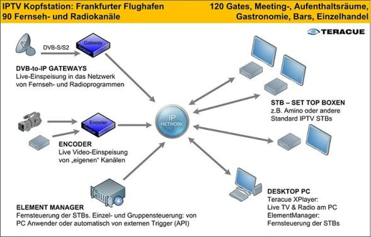 (openPR) Am Frankfurter Flughafen ist heute schon Standard, was andernorts noch Zukunftsmusik ist: Das Fernseh- und Radioprogramm wird mittels IPTV auf dem gesamten Flughafengelände verteilt. Als Basis dient dafür die vorhandene Netzwerkinfrastruktur. Für die Distribution nutzt die Betreiberfirma Fraport AG IPTV- Hard-und Software des Herstellers Teracue.