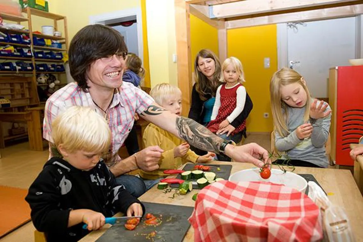 Volker’s Küchenzwerge erfahren spielerisch, wie lecker selbstgekochtes Essen schmecken kann. Außerdem lernen sie an den Mittagen durch gezielte Sinnesschulung und eigene Experimente viel über den Umgang und die Qualität von Nahrungsmitteln.