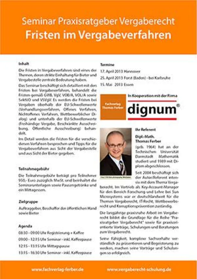 Der Referent, Herr Dipl.-Math. Thomas Ferber, beschäftigt sich seit 2004 intensiv mit dem Thema Vergaberecht. Im Vertrieb als Key-Account-Manager für den Bereich Forschung und Lehre bei Sun Microsystems war er deutschlandweit für die Themen Vergaberecht, IT-Recht, Wettbewerbsrecht und Korruptionsprävention zuständig. Die langjährige praxisnahe Arbeit bildet die Grundlage für die Buch- und Seminarreihe “Praxisratgeber Vergaberecht”. Seine Fähigkeit, komplexe Sachverhalte verständlich zu präsentieren und Begeisterung zu wecken, machen seine Vorträge und Schulungen so erfolgreich.