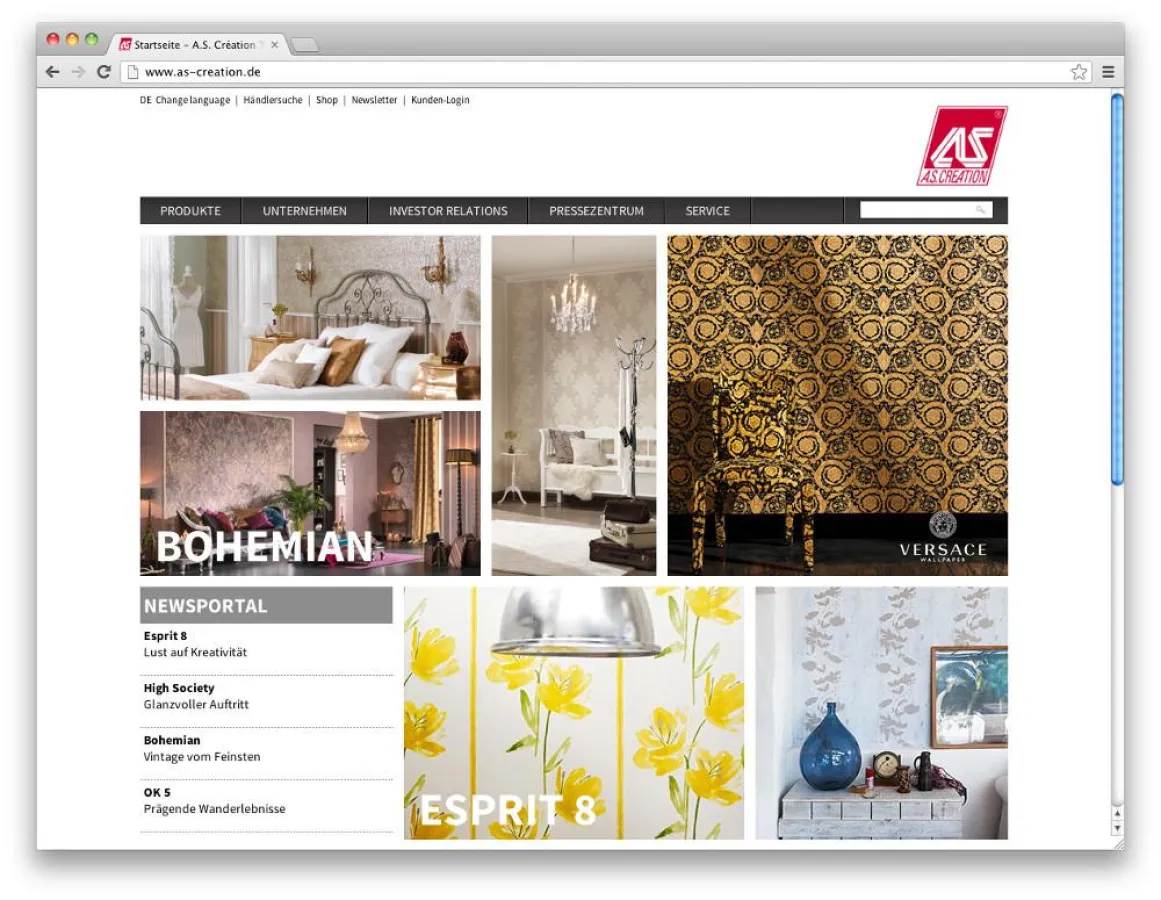 Die Highlights und Produktneuheiten des Tapetenherstellers stehen dabei im Mittelpunkt der Seite. Raumbilder sowie aussagekräftige Kurzfilme zu Kollektionen, wie beispielsweise „Surfing & Sailing – der Film“, veranschaulichen die Welt der Tapete und inspirieren den Interessenten. Das Pressezentrum informiert über die aktuellsten Nachrichten aus den Bereichen Sortiment, Unternehmen oder Investor Relations. Im Bereich Service findet der Betrachter einfach und schnell die Handelspartner von A.S. Création. Unter „Tapetenberatung und -verarbeitung“ werden jede Menge nützliche Hintergrundinformationen zu Tapetenarten und Symbolen, sowie eine optimale Verarbeitungsanleitung inklusive Schulungsvideos zum Tapezieren gezeigt. Die Finanznachrichten der A.S. Création Tapeten AG werden wie gewohnt im Bereich Investor Relations veröffentlicht.