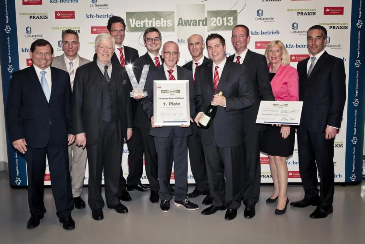Die Redaktionen der Fachmedien »kfz-betrieb« und »Gebrauchtwagen Praxis« haben heute den deutschlandweiten, neutralen und markenübergreifenden »kfz-betrieb«-Vertriebs-Award 2013 vergeben. Die Preisverleihung mit mehr als 150 Branchenexperten aus Handel, Gewerbe und Industrie fand im Vogel Convention Center in Würzburg statt. Den ersten Platz erreichte die Fahrzeug-Werke LUEG AG. Die beiden Fachmedien »kfz-betrieb« und »Gebrauchtwagen Praxis« haben zusammen mit den Sponsorpartnern CarGarantie und Santander Consumer Bank damit die zehn innovativsten Vertriebsprofis im Kraftfahrzeughandel gekürt. Rund 300 Betriebe nahmen an dem markenübergreifend und deutschlandweit ausgeschriebenen Wettbewerb teil. „Die zehn ausgewählten Gewinnerbetriebe sind die Top-Händler des deutschen Kfz-Gewerbes – hier finden die Kunden die besten Bedingungen für den Autokauf vor“, so »kfz-betrieb«-Chefredakteur Wolfgang Michel.
