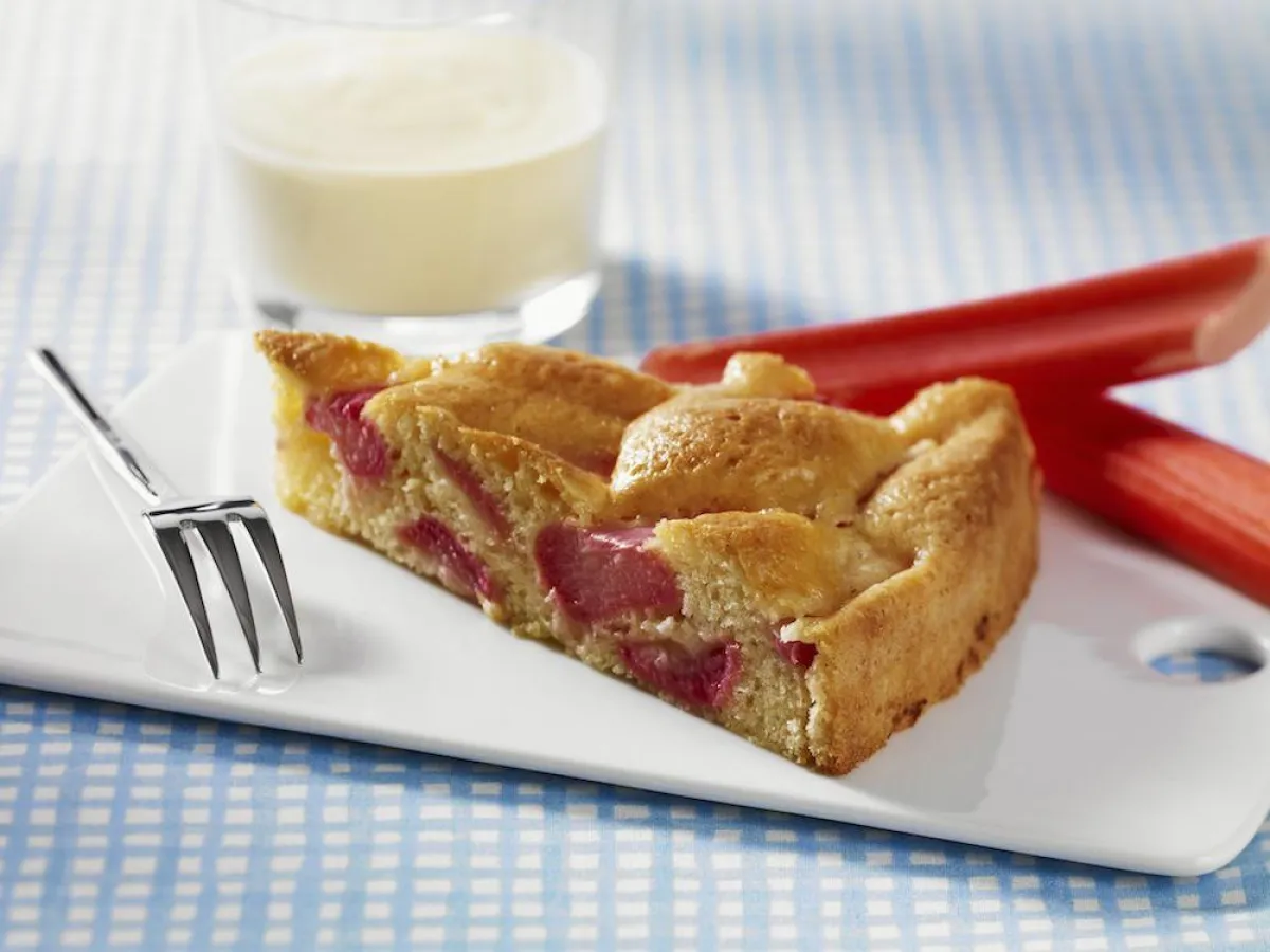 3. Den Teig in die Form füllen, glatt streichen, den Rhabarber darauf streuen und im Ofen ca. 45 Minuten backen. Aus dem Ofen nehmen und in der Form auskühlen lassen.?Aus der Springform lösen und in Stücke geschnitten servieren.