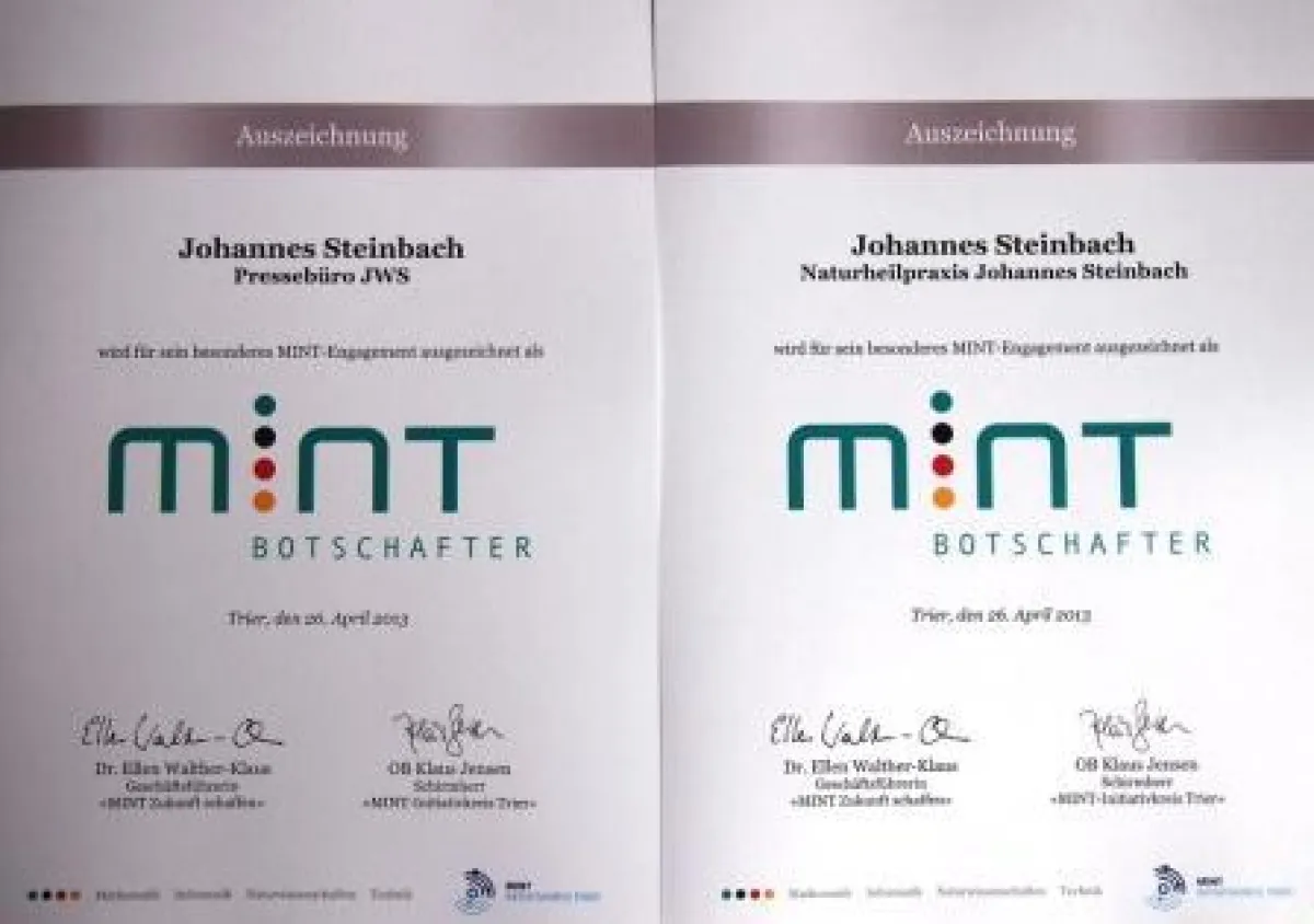 (openPR) Ausgezeichnet: Johannes W. Steinbach ist Botschafter des "MINT-Initiativkreis Trier": dem Talentförderungsprojekt der Bereiche Mathematik, Informatik, Naturwissenschaften und Technik des kommunalen Bildungsmanagements der Stadt Trier. Schirmherr des Projekts ist der Trierer Oberbürgermeister Klaus Jensen. Im Rahmen des 15. Trierer Bildungsgesprächs wurden neben Steinbach 39 weitere MINT-Botschafter für ihr besonderes Engagement ausgezeichnet.