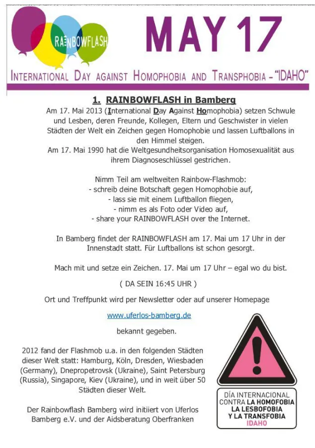(openPR) Am Freitag, 17. Mai findet wieder der alljährliche internationale „Day against Homophobia“ statt – ein Tag gegen Schwulen- und Lesben-Feindlichkeit. Weltweit finden hierzu Aktionen statt. Auch in Bamberg setzt der seit 35 Jahren bestehende Verein Uferlos e.V. ein Zeichen, indem er in der Innenstadt einen Rainbowflash veranstaltet.