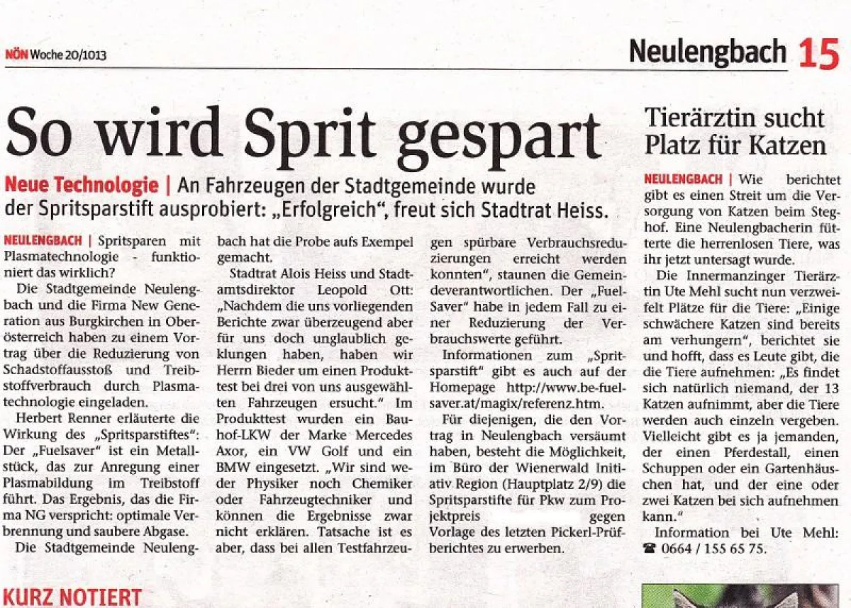 … Besonders in Österreich geht der Siegeszug des nur wenige Zentimeter langen Metallstiftes unverändert weiter. Nach anderen Kommunen hat nun auch die niederösterreichische Stadt Neulengbach ihren gesamten Fuhrpark mit dem Spritsparer umgerüstet. Die führende Österreichische Kronen Zeitung hat über die revolutionäre Plasmatechnologie ausführlich berichtet. …