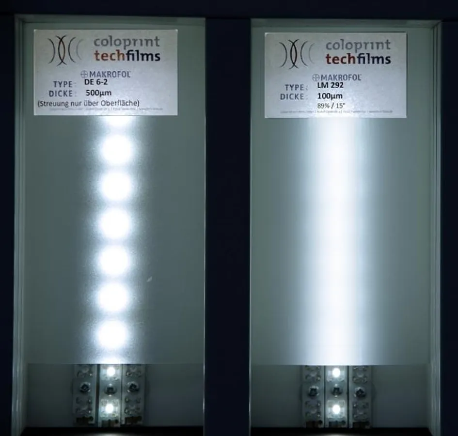 Ziel bei den Neuentwicklungen war unter anderem, Designern ein Mittel zur Verfügung zu stellen, Licht in der gewünschten Form zu lenken und streuen. So vermag Makrofol® LM 322 selbst bei geringsten Abständen zum Leuchtmittel das Licht flächig sehr gleichmäßig zu streuen. Kleine Bauformen und dennoch gute Ausleuchtung bei möglichst geringer Anzahl von Strahlern reduzieren Kosten und erhöhen die Wertigkeit des Produktes.